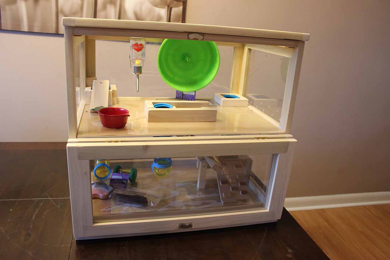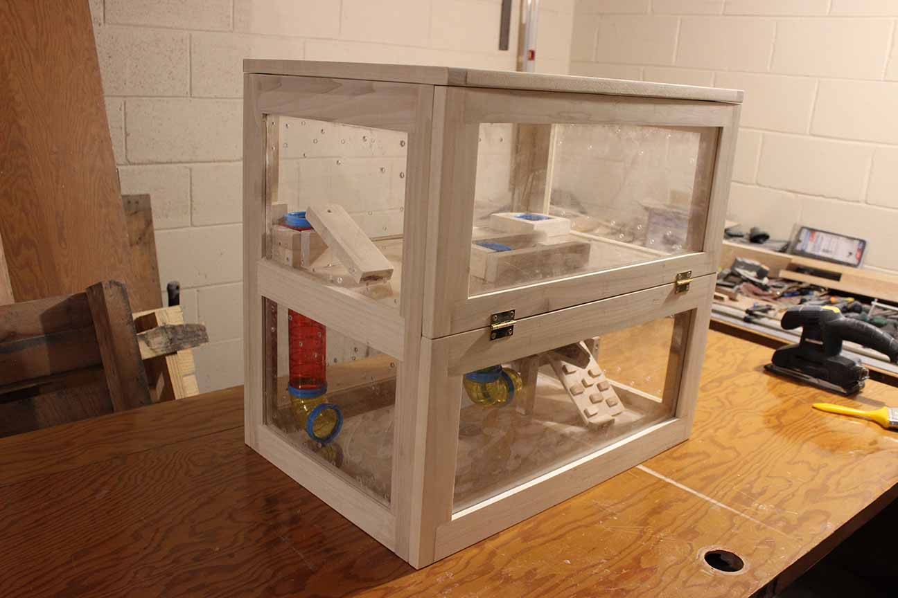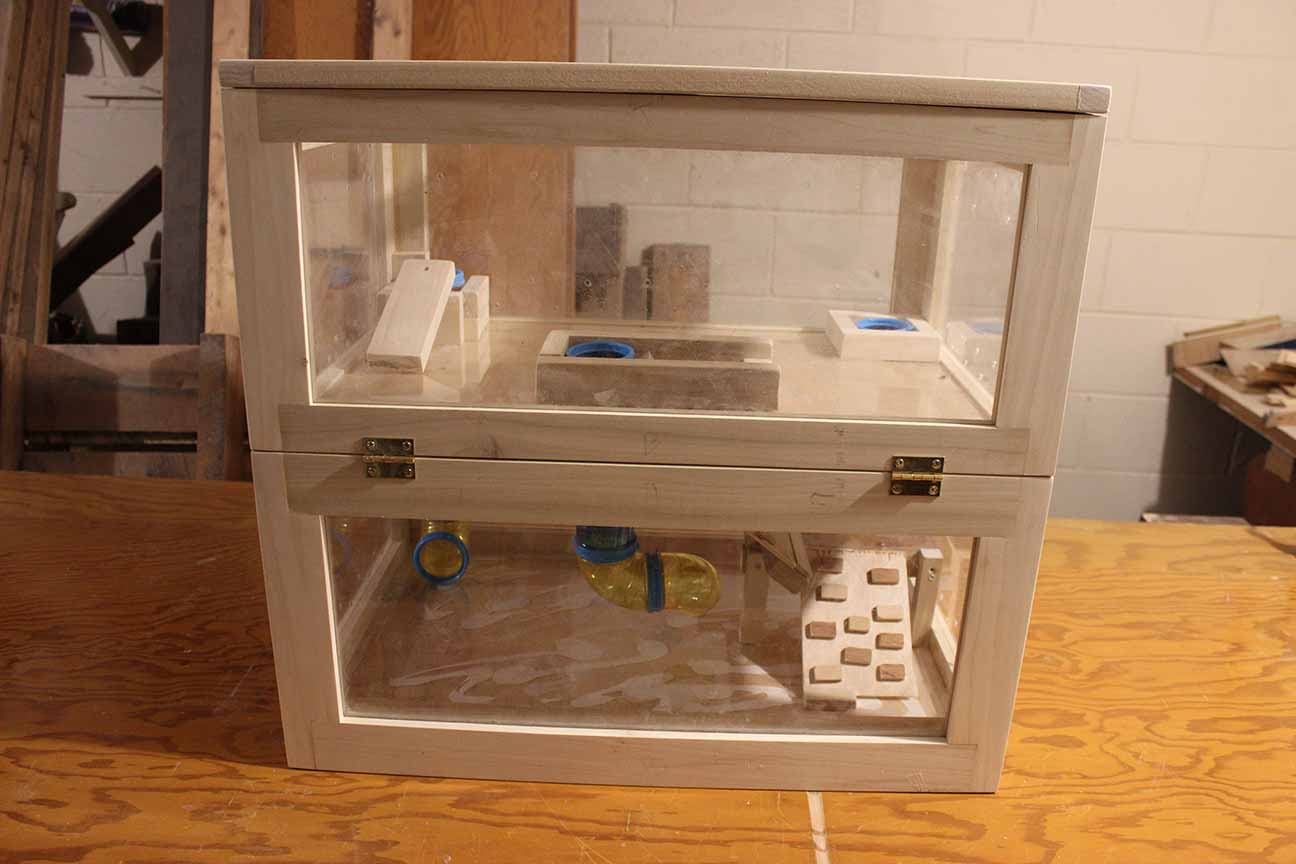 A freshly sanded Hammy Box, still needs some cleanup.I hung a water bottle from the back top edge on the inside using a couple of screws and the mounting mechanism that came with it, use your imagination here. There are lots of options as far as where to place the water, I wanted easy access from the top, this way it can be removed and refilled without disturbing the box inhabitants.