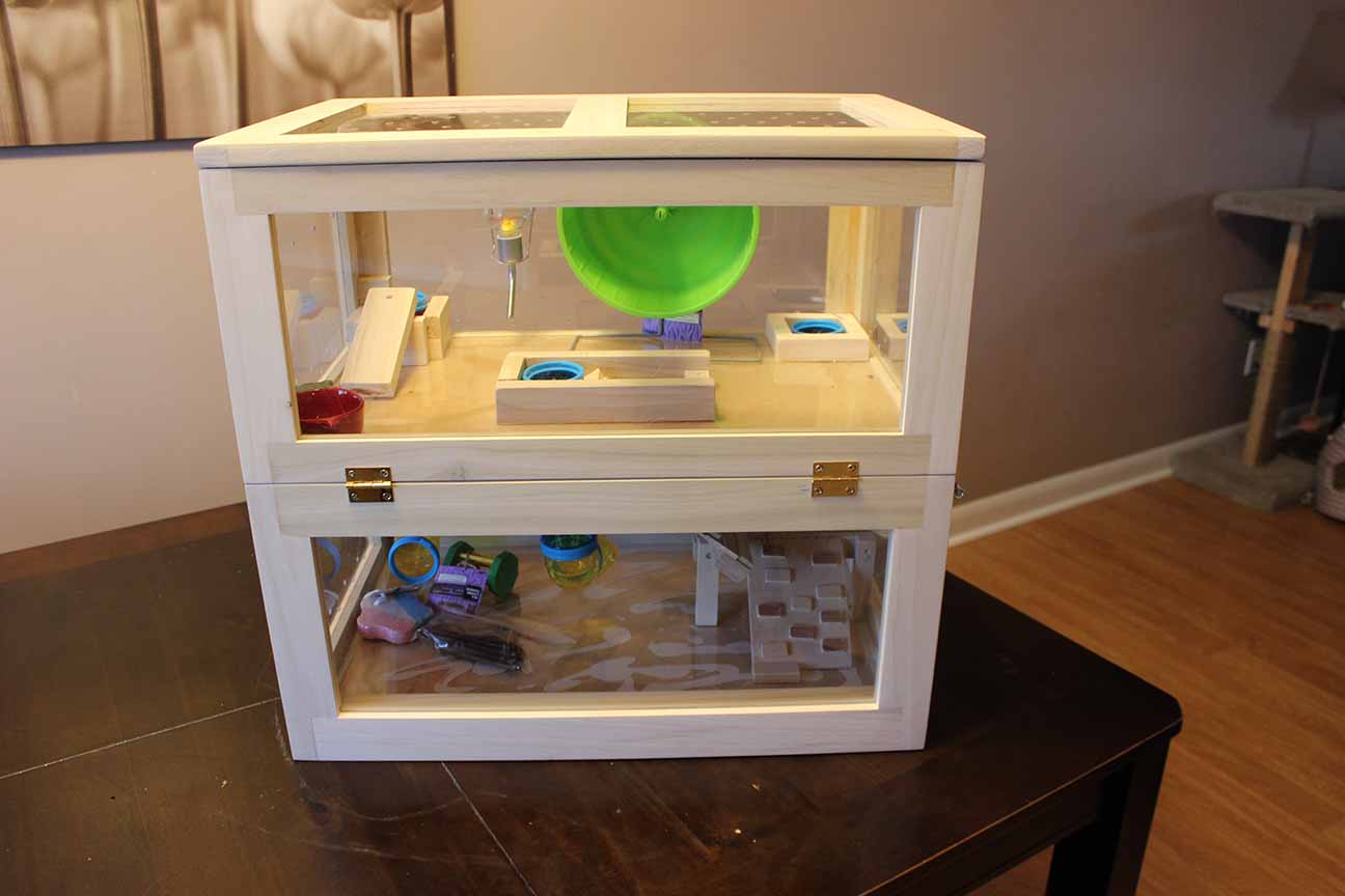 Here you can see the nice chewable edging around each entrance on the second floor.I created nice wood edges with scrap poplar and used them to frame each hole. This added a decorative touch and hid the wood/plexiglass edge of the floor panel. I made the edges nice and thick so they could function as a chewable surface as well.