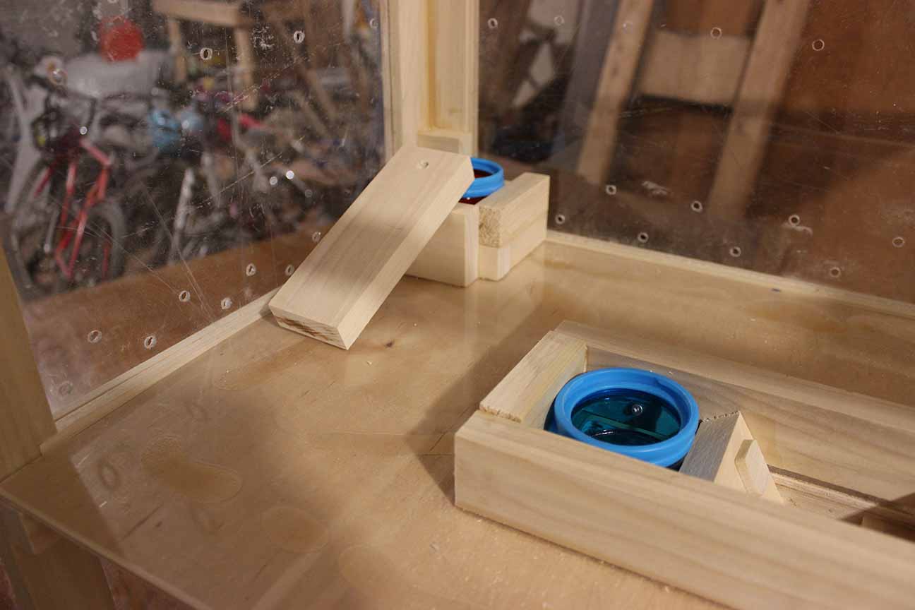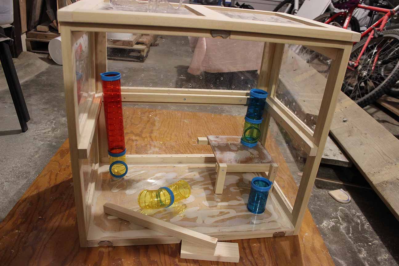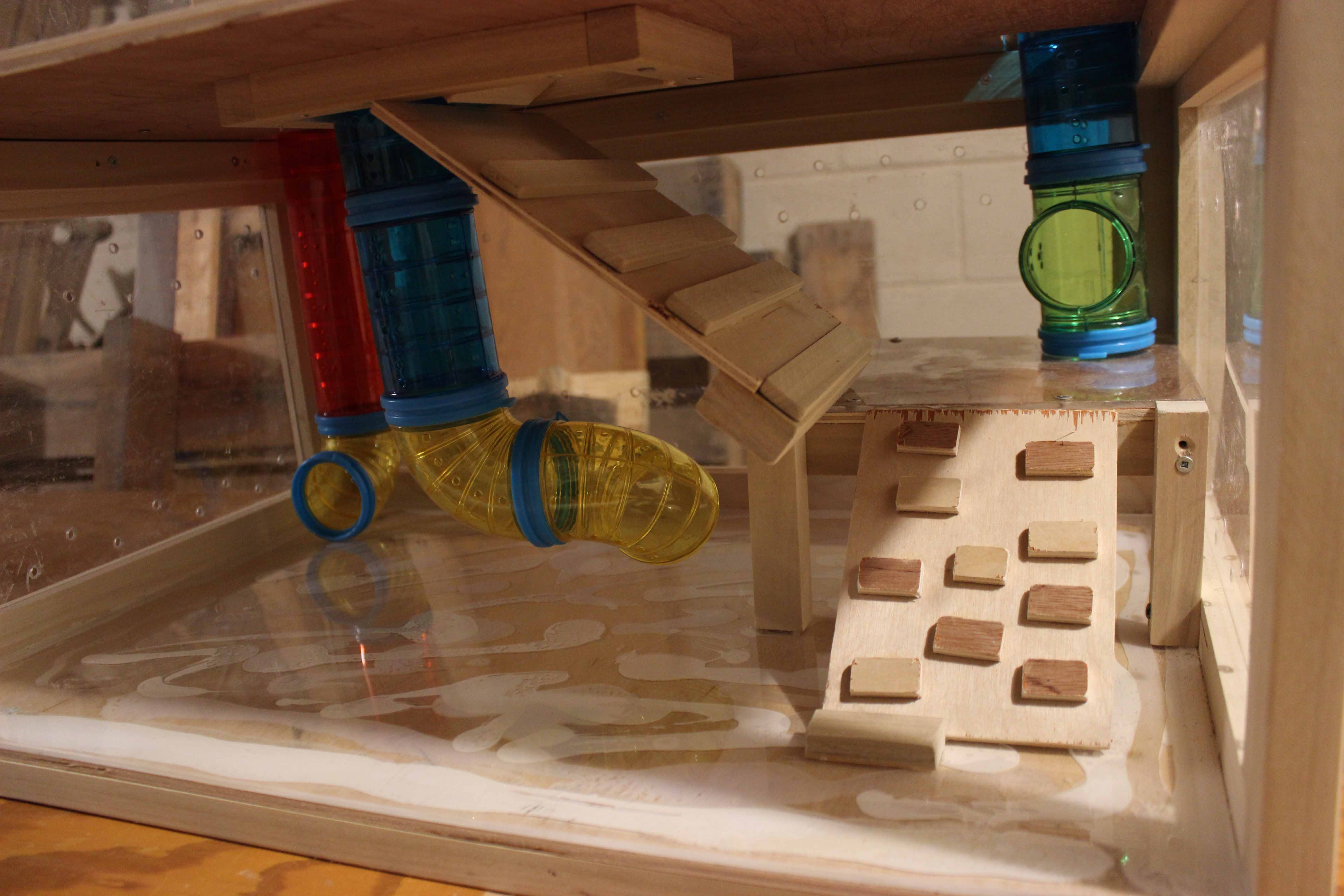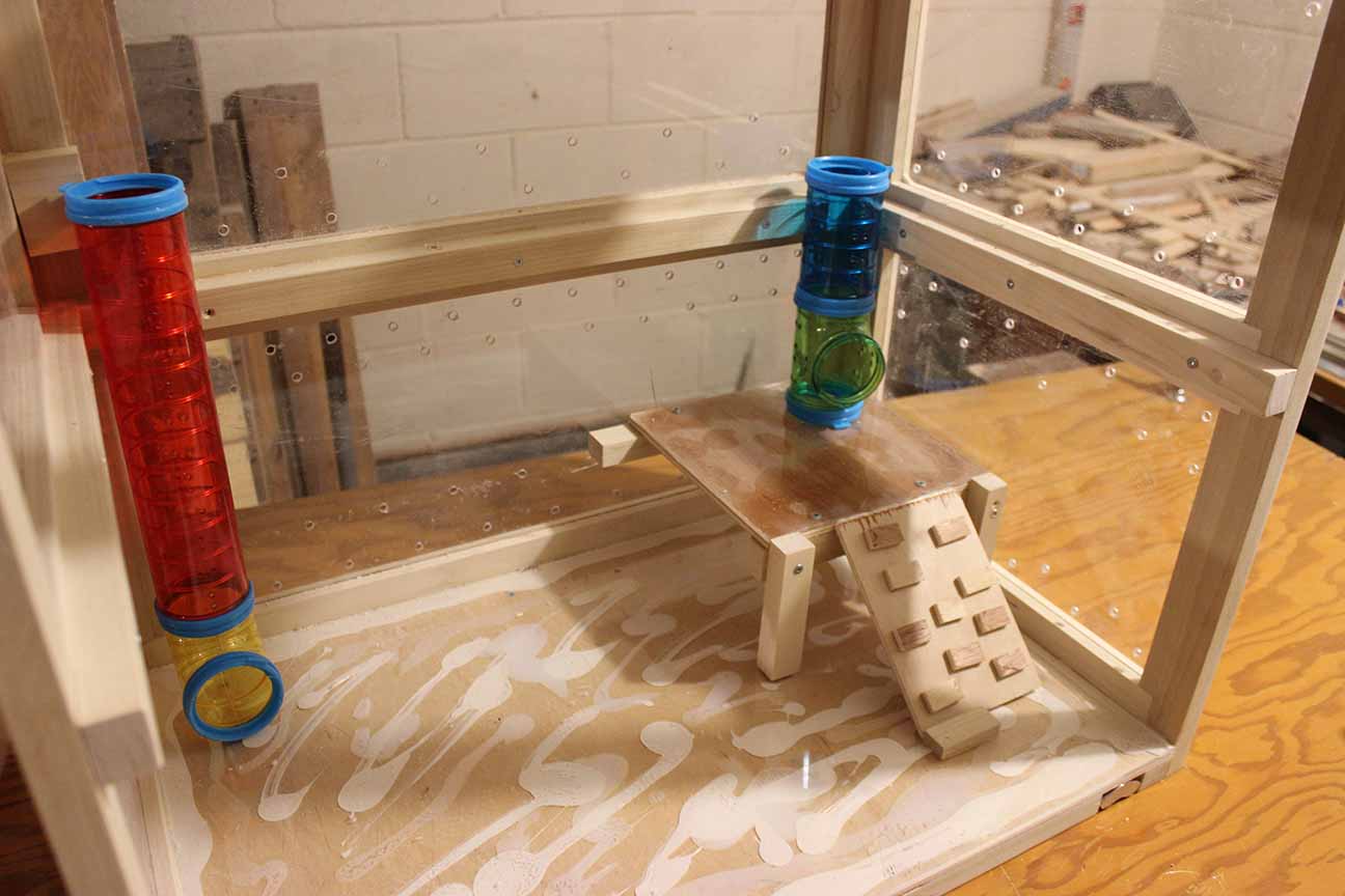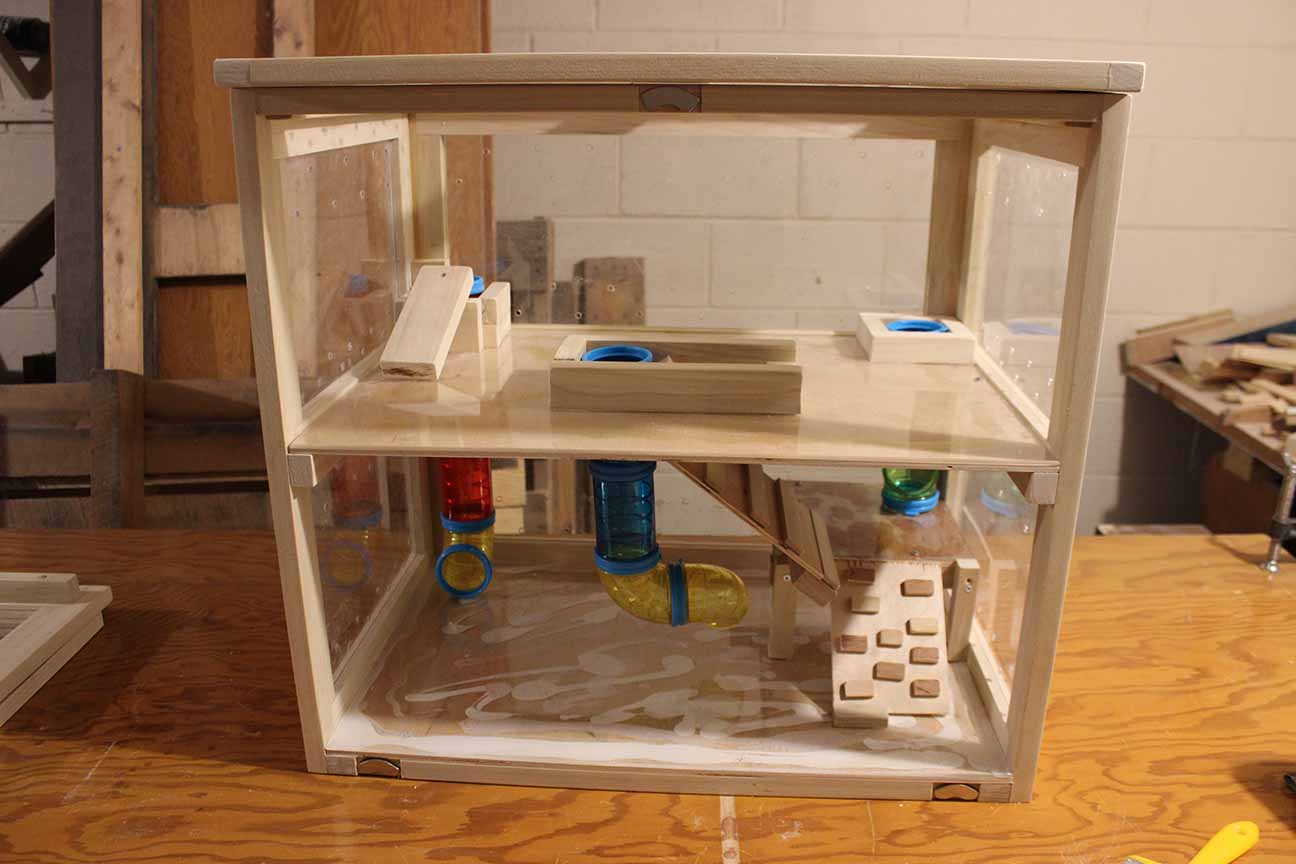 I tried to create some variety and obstacles in the hamster habitat. I held the wooden pieces in place using a combination of glue and short screws from underneath the floor. I also attached the main ramp directly to the second floor panel.